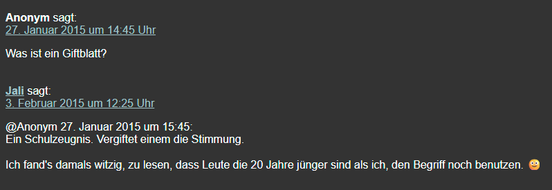 Aber auch Jule hatte manchmal ein seltsames Wording und nannte Zeugnisse „Giftblätter“. Kommentar dazu in ihrem Blog;