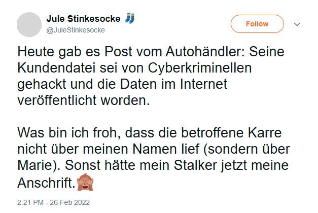 Und daran änderte sich auch bis 2022 nicht, sonst hätte der nächste Stalker aus dem Jahr 2015 sie ja nicht unter ihrem Namen finden können - warum auch immer er gehackte Daten eines Autohändlers im Internet durchsuchen sollte: