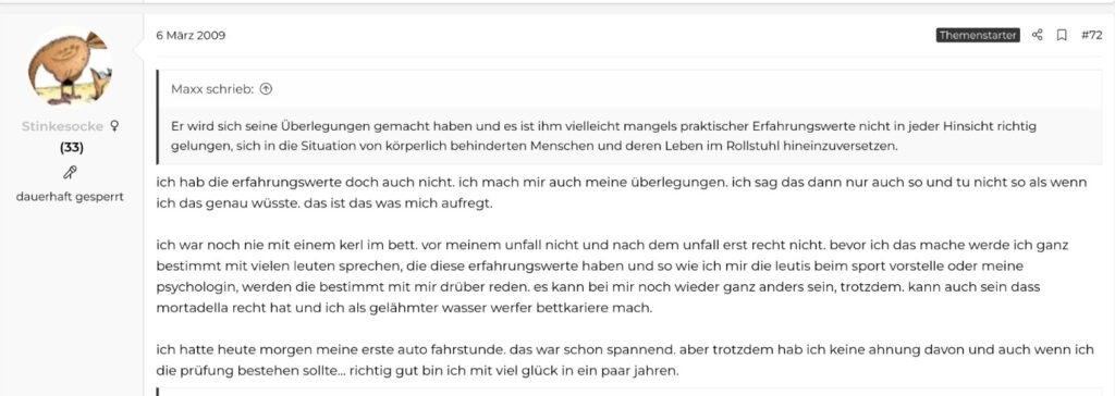 Eine Rollstuhlfahrerin, die ich entfernt vom Sport kenne, möchte von zu Hause ausziehen und sucht ebenfalls einen WG-Platz, zusammen mit ihrem Freund. Sie sind 18 bzw. 20 Jahre alt. Außerdem hat eine 24-jährige, die zwar schon länger als ich, aber trotzdem noch relativ neu im Rollstuhl sitzt, ganz lockeres Interesse gezeigt. Sie will es sich überlegen, aber grundsätzlich möchte sie schon auf lange Sicht von zu Hause raus.