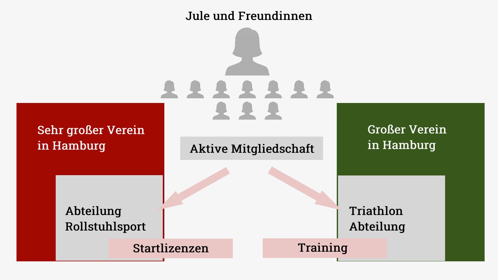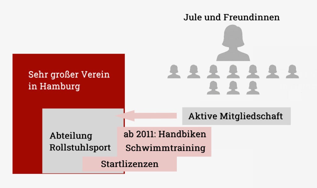 Es ist anzunehmen, dass es sich hierbei um ihren inklusiven Sportverein handelt und sie selbst dort schwimmt, da es eher unwahrscheinlich ist, dass ihr nicht vorhandener Triathlonverein auch noch zufällig Paraschwimmen anbietet. Falls Jule wirklich für einen Paratriathlon trainiert hat, sah das einzig mögliche Vereinskonstrukt (ohne Rennrollstuhl-Training) so aus: